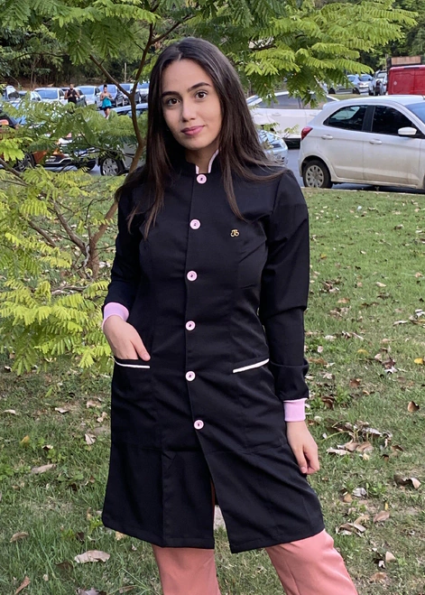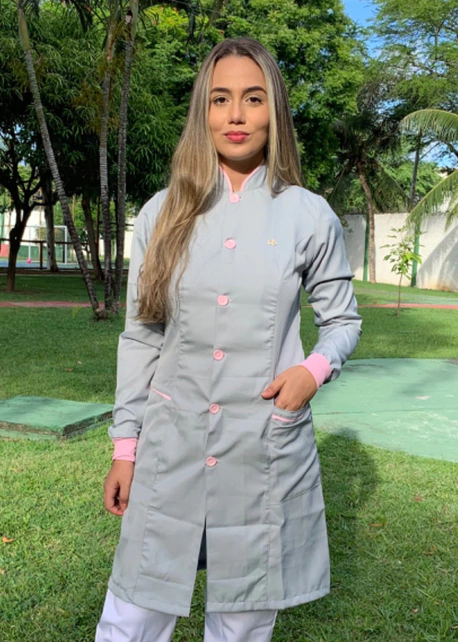 Jaleco com rosa, friso rosa na gola bolso e pala das costas como detalhe do jaleco Punhos de ribana rosa bb.