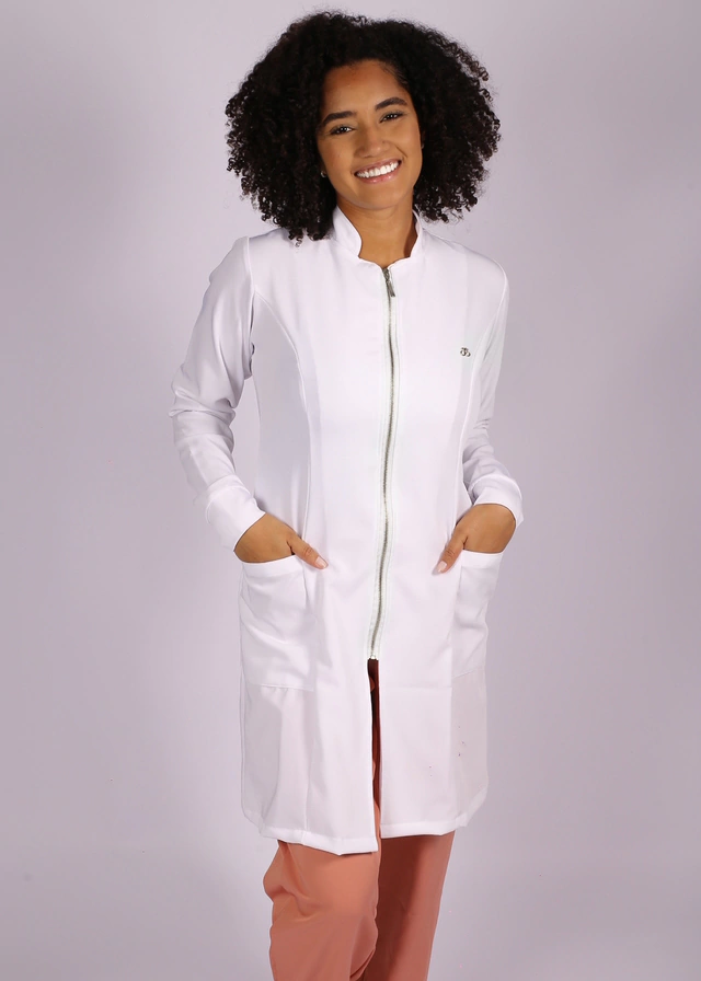 Jaleco com botões e zíper dourado destacável, e punhos do próprio tecido.