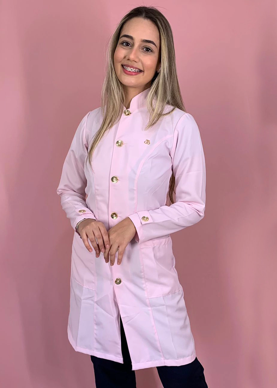 Jaleco com botões dourados e detalhe no punho.