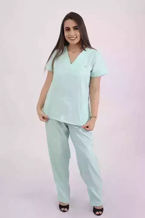 Blusa gola V com bolsos inferiores, calça com elástico e bolso nas costas.