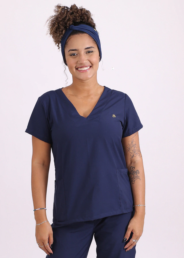 Blusa gola V com bolsos inferiores, calça jogguer com elástico e bolso nas costas.
